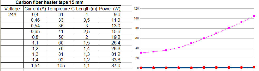 The smaller area of the carbon cord causes less heat loss to the air and a higher temperature compared to the carbon tape (and the same idea 15mm vs 44mm). Comparing heated clothing you should to compare the power but not the temperature.